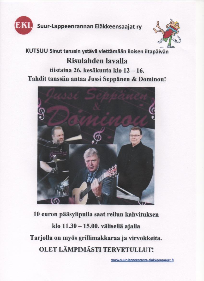 Suur-Lappeenrannan Eläkkeensaajat ry kutsuu tanssikansaa iloiseen iltapäivään. Katso kyydit paikallislehden seuratoimintapalstalta.